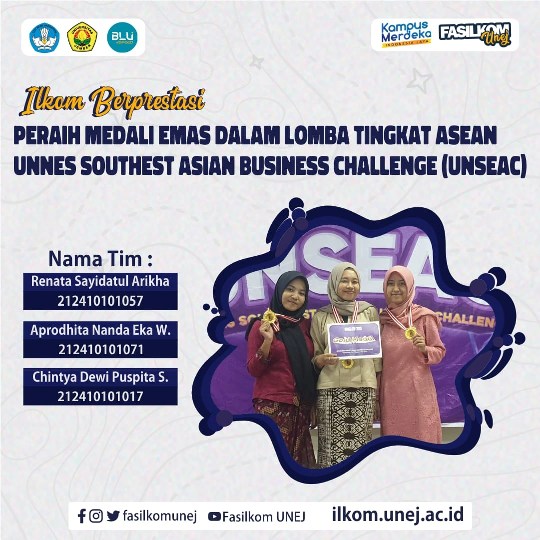 Tim dari FASILKOM UNEJ yang beranggotakan 3 Mahasiswi kemarin berhasil mendapatkan medali emas dalam lomba tingkat ASEAN yaitu UNNES Southest Asian Business Challenge (UNSEAC)