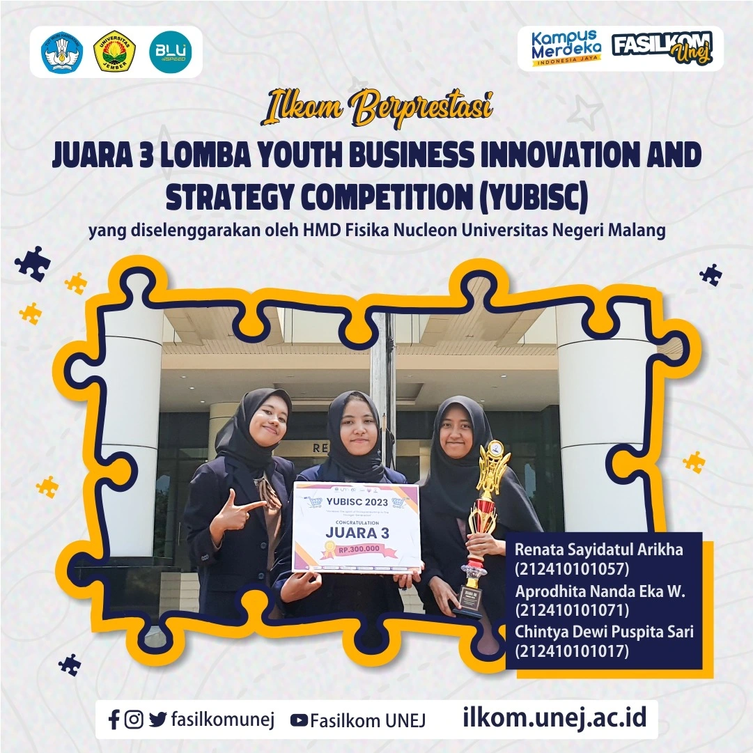 Tim dari Fasilkom Unej yang beranggotakan 3 mahasiswi Fasilkom berhasil mendapatkan juara 3 lomba Youth Business Innovation and Strategy Competition (YUBISC) yang diselenggarakan oleh HMD Fisika Nucleon Universitas Negeri Malang